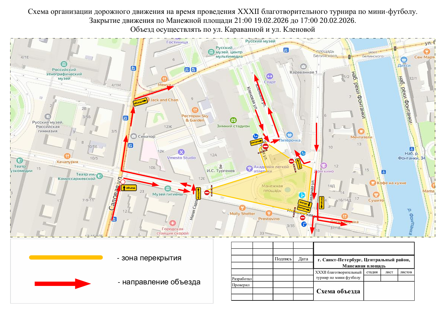 Как сообщила 12 февраля пресс-служба комитета по транспорту Санкт-Петербурга, движение транспорта будет перекрыто на Манежной площади и на Кленовой улице вдоль дома 4. Это ограничение будет действовать с 21:00 19 февраля до 17:00 20 февраля.