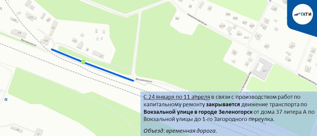 В Зеленогорске до 11 апреля полностью закроют Вокзальную улицу от дома 37, литера А, до 1-го Загородного переулка в связи с капитальным ремонтом. Транспорт будет направлен по временной дороге.