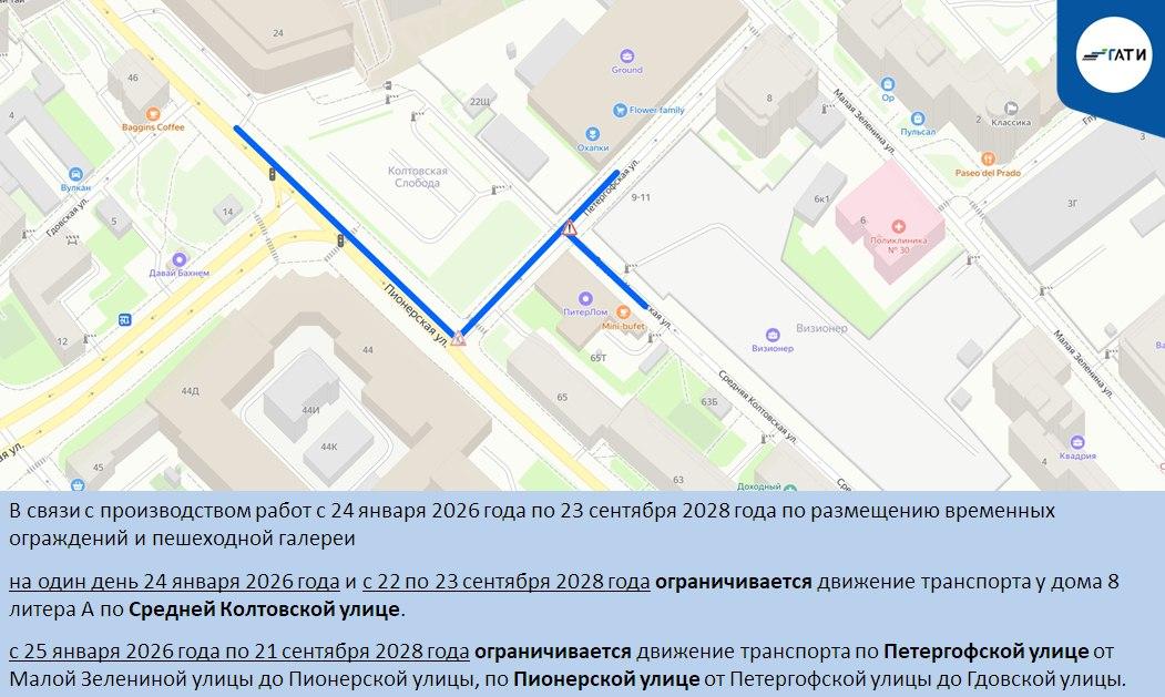 Самые длительные ограничения затрагивают Петроградский район. С 24 января 2026 года по 23 сентября 2028 года перекроют Петергофскую улицу от Малой Зелениной улицы до Пионерской улицы и Пионерскую улицу от Петергофской до Гдовской улицы. Также 24 января 2026 года и с 22 по 23 сентября 2028 года ограничат проезд у дома 8, литера А, по Средней Колтовской улице.