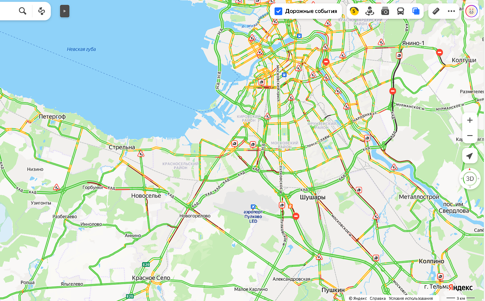 Сервис «Яндекс.Пробки» сообщает о критической обстановке на южных магистралях, ведущих к КАД. Пулковское шоссе загружено от мемориального комплекса «Пулковский Рубеж» до кольцевой, а Московское шоссе — от АЗС «Газпромнефть» до Витебского проспекта.