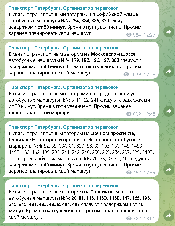 Из-за пробок на Предпортовой улице, Дачном проспекте, бульваре Новаторов, проспекте Ветеранов, Таллинском, Московском шоссе и Софийской улице автобусы задерживаются на 40–50 минут. По данным «Организатора перевозок», время в пути увеличено для нескольких десятков маршрутов.