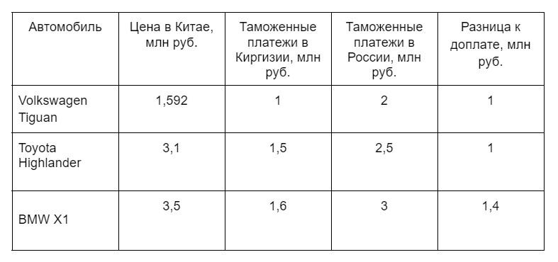 Согласно новым правилам, при ввозе того же Volkswagen Tiguan из Китая через Киргизию с 1 апреля при постановке на учёт в России потребуется доплатить разницу в таможенных платежах, которая оценивается примерно в 1 млн рублей (12,6 тыс. долларов). Аналогичные расчёты справедливы и для других популярных моделей, таких как Toyota Highlander и BMW X1.