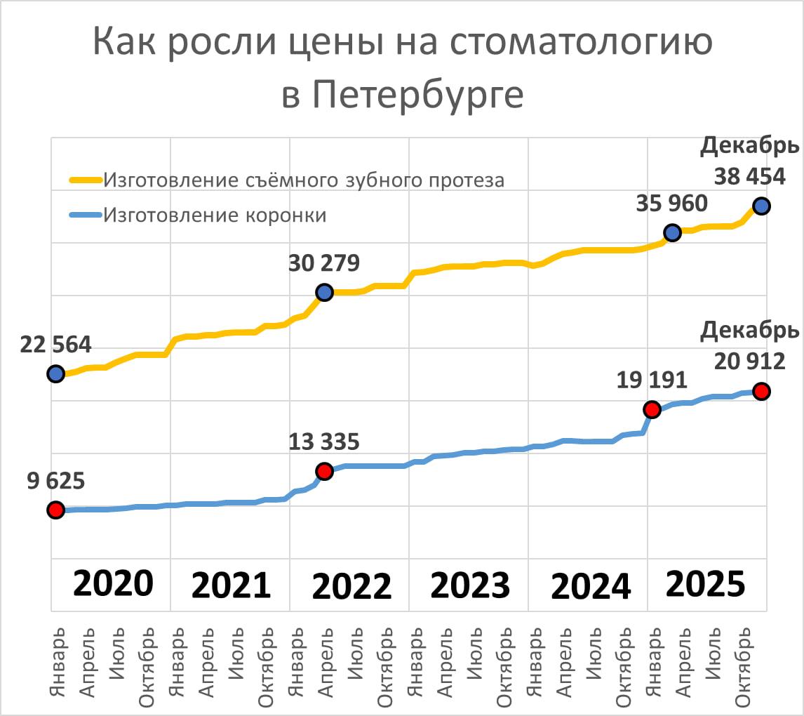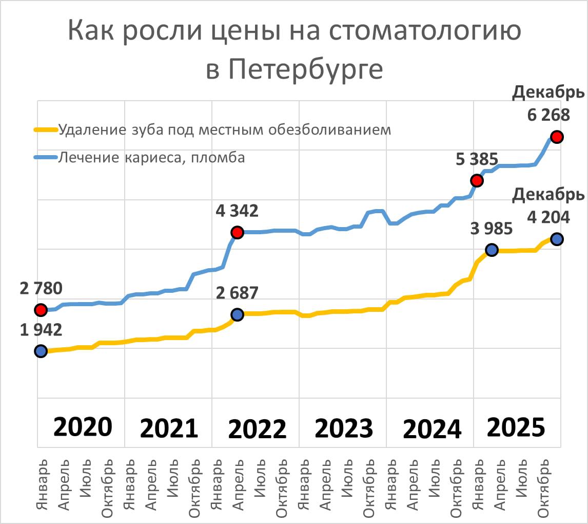 Цены на стоматологические услуги растут опережающими инфляцию темпами. Лечение кариеса в декабре в среднем обходилось петербуржцам в 6,3 тысячи рублей, что на 16% выше, чем годом ранее. Удаление зуба с обезболиванием подорожало с 3,9 тысячи рублей в феврале прошлого года до 4,2 тысячи в декабре.
