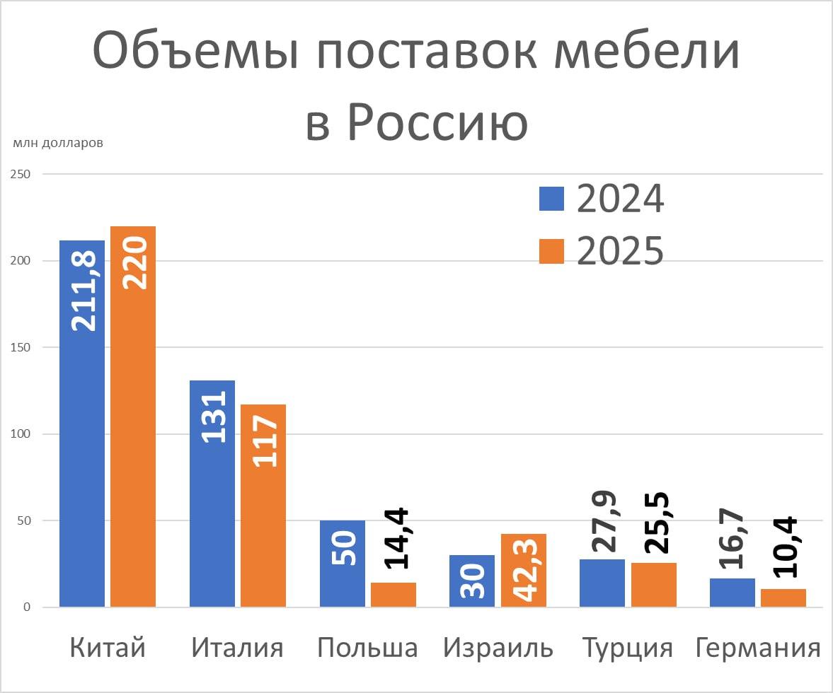 «С 2022 года, несмотря на санкции, объём импорта зафиксировался на уровне около 130 млрд рублей в год, из которых 25-30 млрд рублей приходится на мебель из недружественных стран. Это огромная сумма при том, что наши фабрики уже давно могут полностью обеспечивать внутренний рынок на 100% — и по ассортименту, и по ценовым категориям», — утверждает Шестаков. Основными странами-импортёрами, помимо Китая, он назвал Италию и Германию.