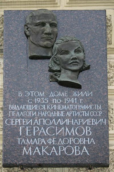 Супруги проживали в этом доме с 1935 по 1941 год. Их фильм «Маскарад», где Герасимов выступил режиссёром, а Макарова сыграла Нину, был завершён за день до начала Великой Отечественной войны. Герасимов совместно с Михаилом Калатозовым снял первый в истории кинематографа фильм о войне, посвящённый Ленинграду, а Макарова исполнила в нём одну из главных ролей.