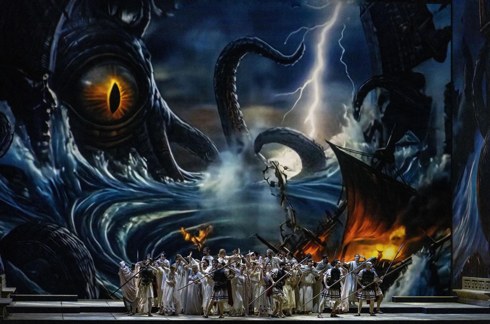 Постановка была создана в сжатые сроки, что отразилось на сценографии. Вместо традиционных декораций зрителям предложили масштабное мультимедийное шоу. Режиссер Роман Кочержевский вместе с художником Глебом Фильштинским и видеохудожником Игорем Домашкевичем создали динамичный визуальный мир в барочном духе. Всё пространство сцены было заполнено движущимися изображениями: бушующим морем, плывущими облаками, языками пламени. Появлялись гигантская маска Нептуна и огромный осьминог, разрушающий колонны храма.
