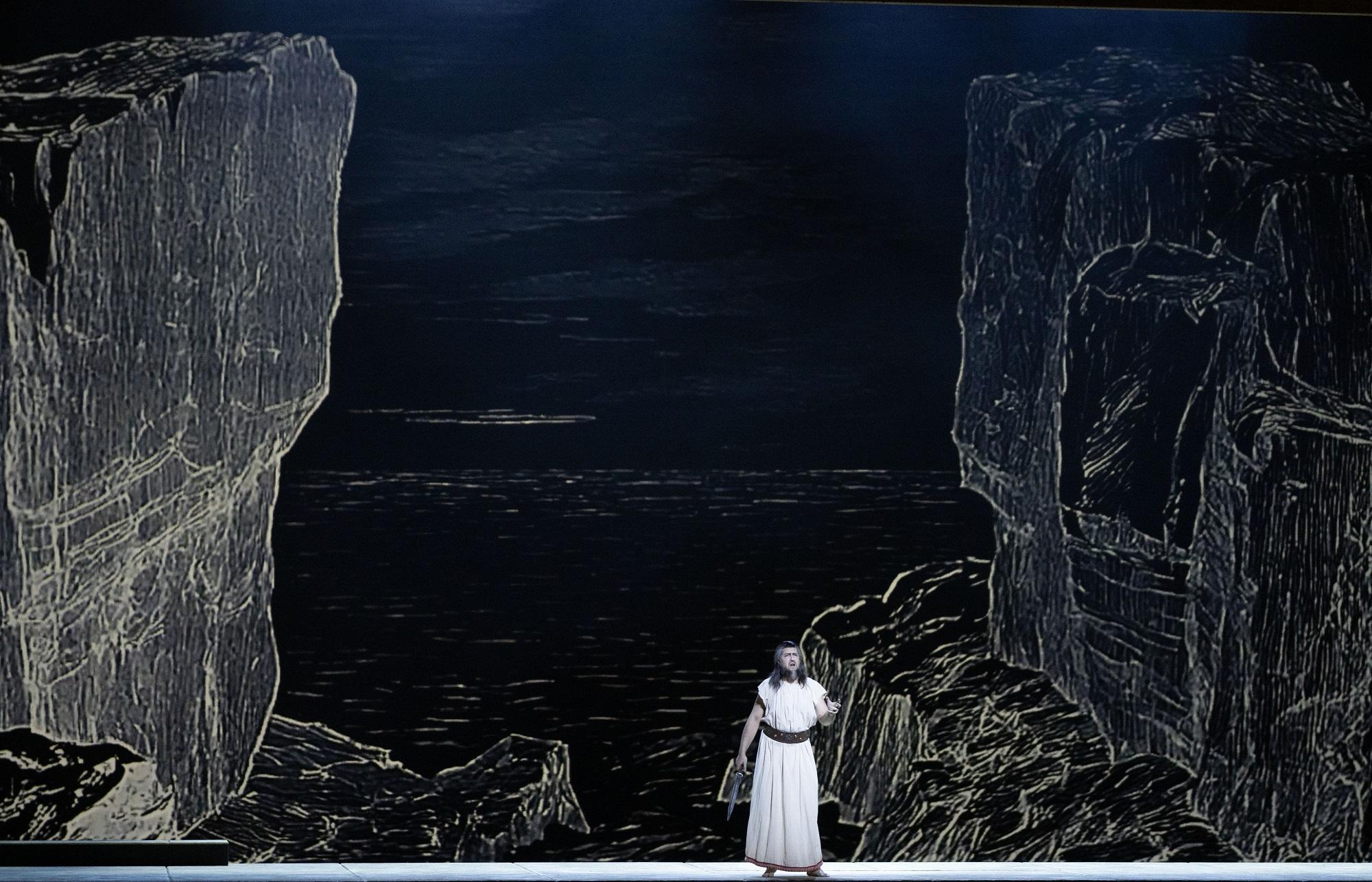 Певцы, облаченные в стилизованные античные костюмы, располагались преимущественно на авансцене. Их статичные, подобные древнегреческим изображениям на вазах, позы контрастировали с непрерывно меняющейся картинкой на заднем плане. Такой подход позволил сосредоточить внимание на сложных вокальных партиях.
