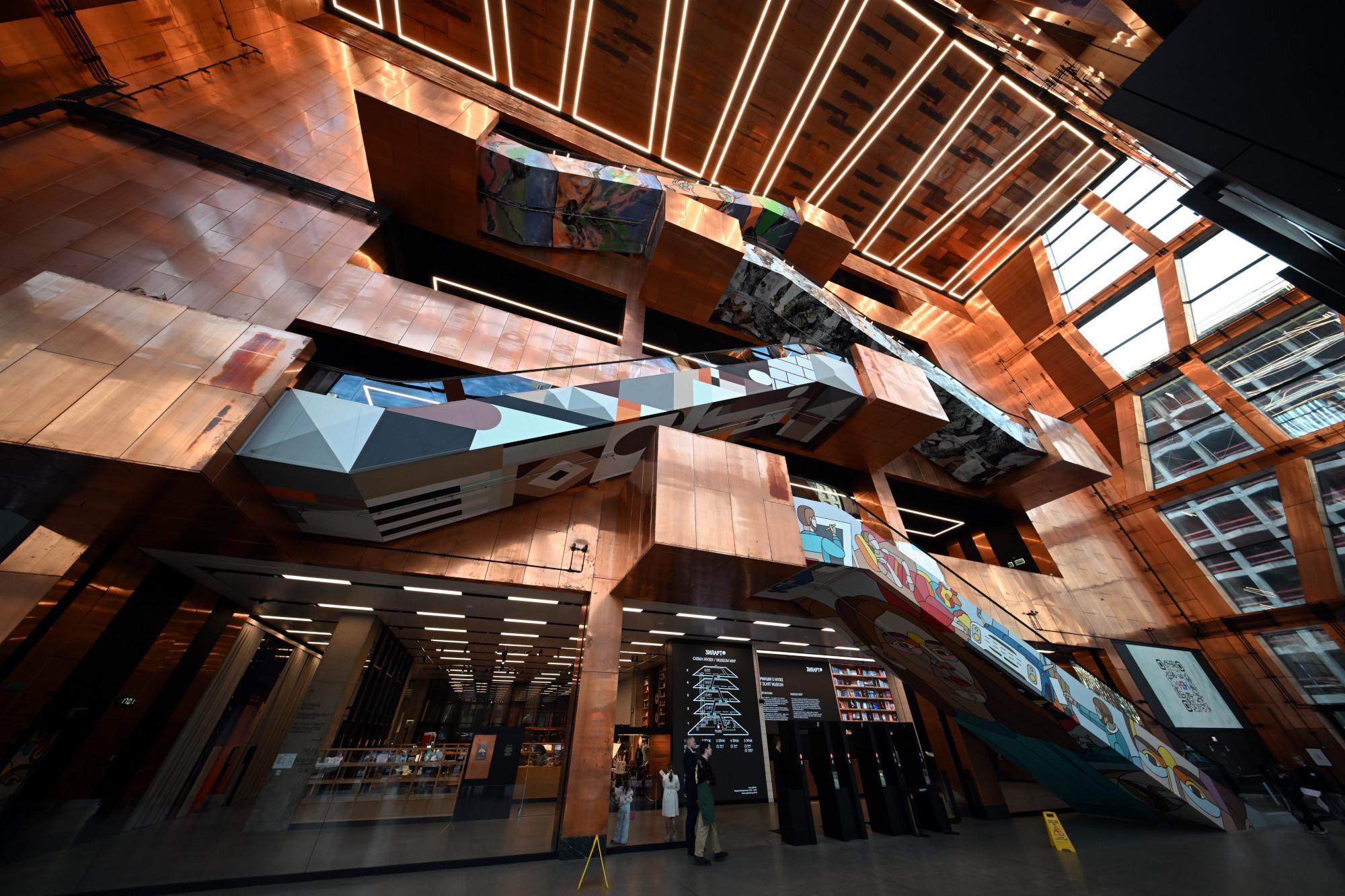 Внутри посетителей встречает просторное пятиэтажное пространство с 30-метровым потолком. Эскалаторы, ведущие на выставки, расписаны уличными художниками. По словам Александра Боровского, здание соответствует всем музейным стандартам, включая температурно-влажностный режим.