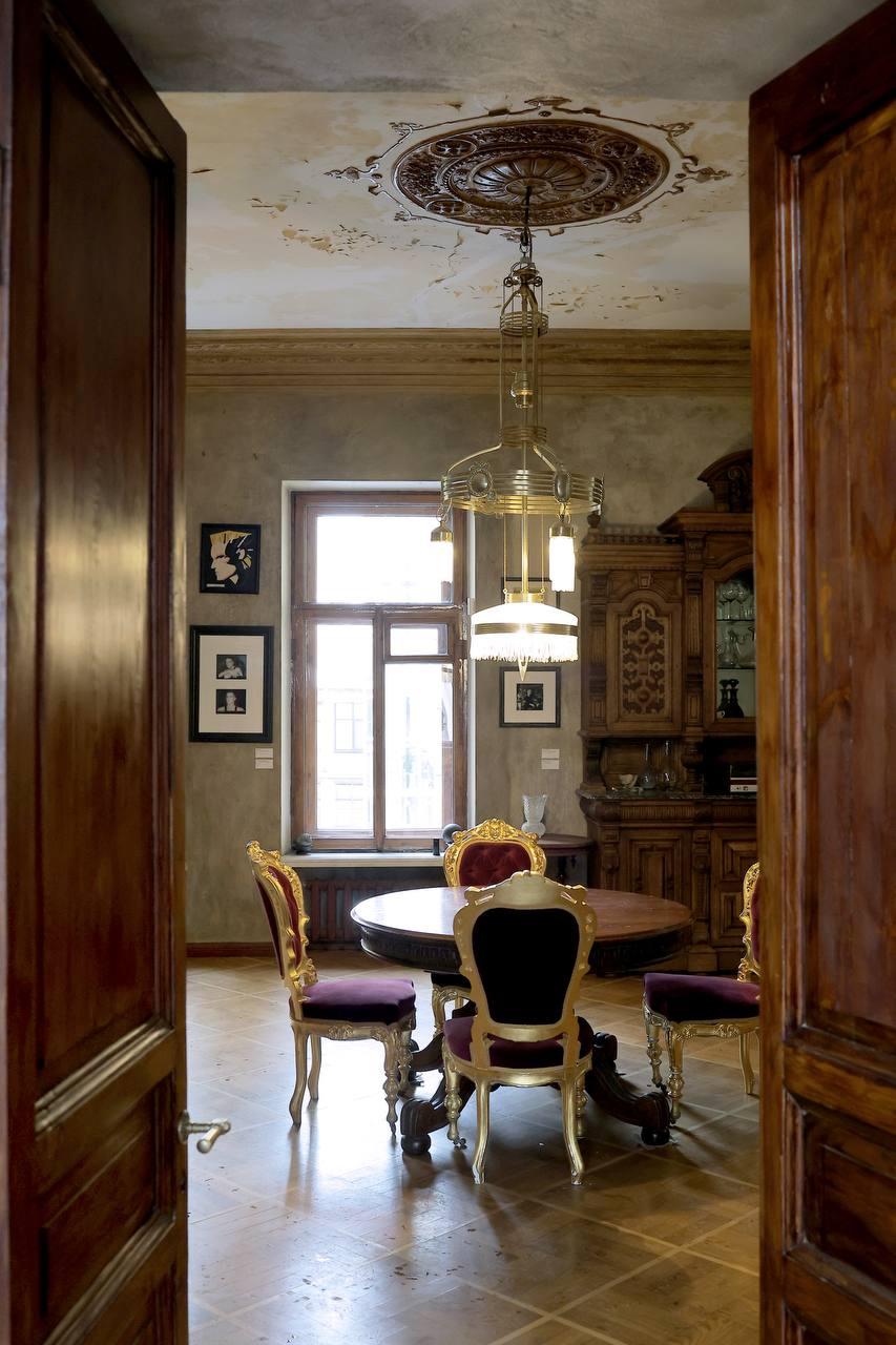 Над золочёным гарнитуром в столовой висит антикварная люстра конца XIX века, которую Гурьянов перевёз из одного из сквотов, где жил ранее.