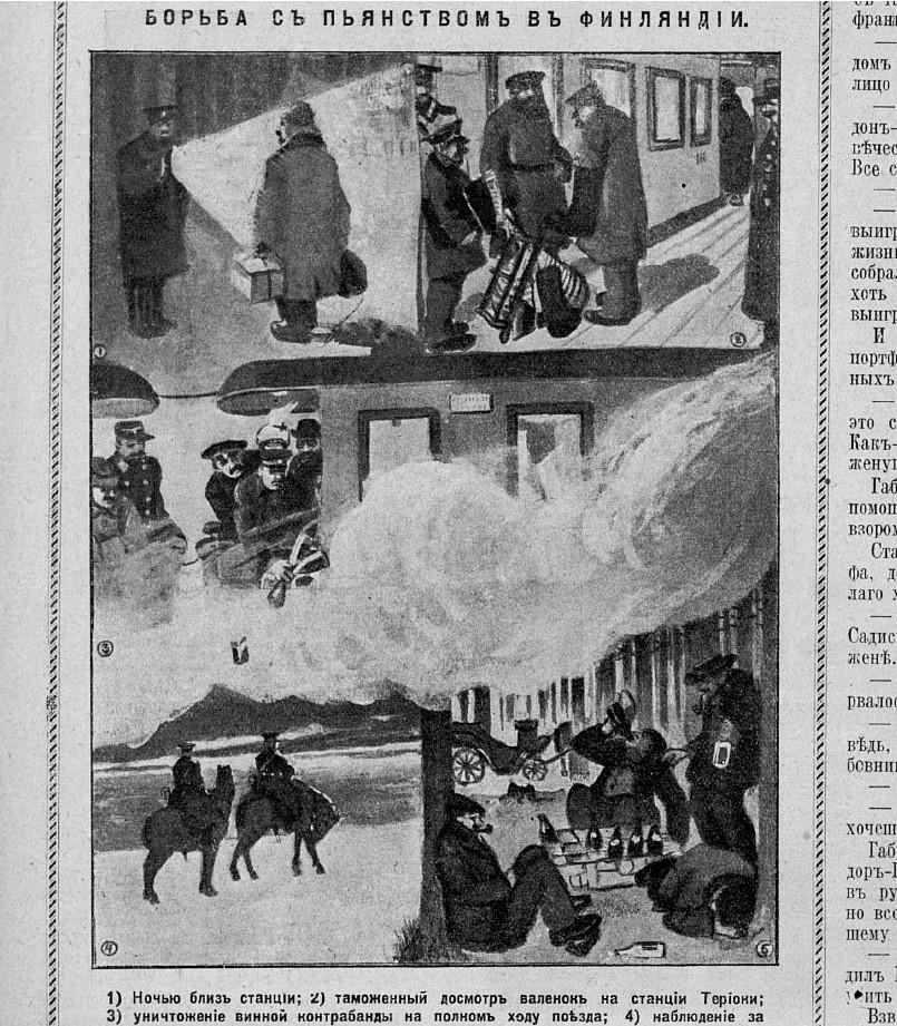 Страница из журнала «Огонёк» за май 1914 года с материалом о борьбе с контрабандой спиртного.