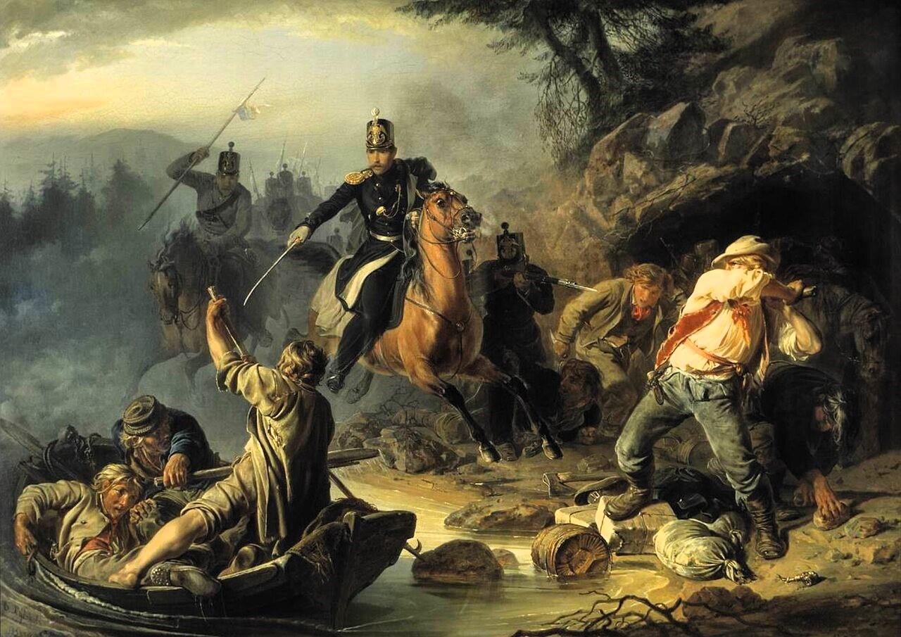 Картина В. Г. Худякова «Стычка с финляндскими контрабандистами» (1853). Холст, масло. Размеры 95,6 х 133,6 см.