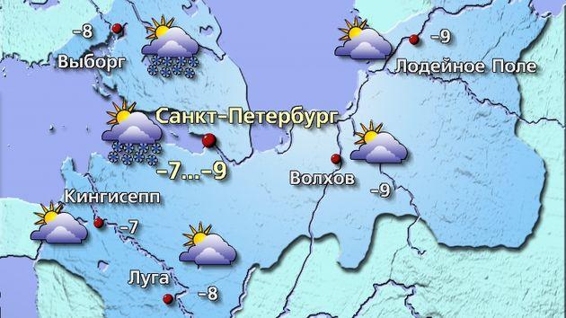 В Санкт-Петербурге прогнозируется умеренный мороз. Температура воздуха составит от -7 до -9 градусов, в области столбики термометров опустятся до -7…-12 градусов. День будет преимущественно облачным, возможны небольшие локальные снегопады. Ветер северо-восточный со скоростью 3–8 метров в секунду. Атмосферное давление, хотя и начнет слабо повышаться, останется на отметке 747 мм рт. ст., что существенно ниже климатической нормы.