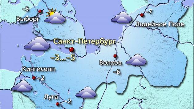 Температура воздуха в городе составит −3…−5 градусов, а в Ленинградской области ожидается от −2 до −7 градусов. Ветер будет дуть с северо-востока со скоростью 3–8 метров в секунду. Атмосферное давление продолжит рост и достигнет отметки в 765 мм рт. ст., что выше климатической нормы.
