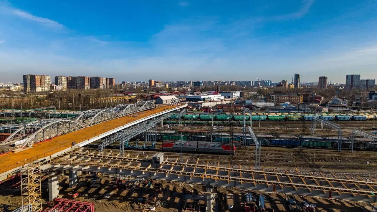 На правом направлении уже установлено пролетное строение, которое проходит над путями Октябрьской железной дороги. Протяженность этого участка — 247 метров.