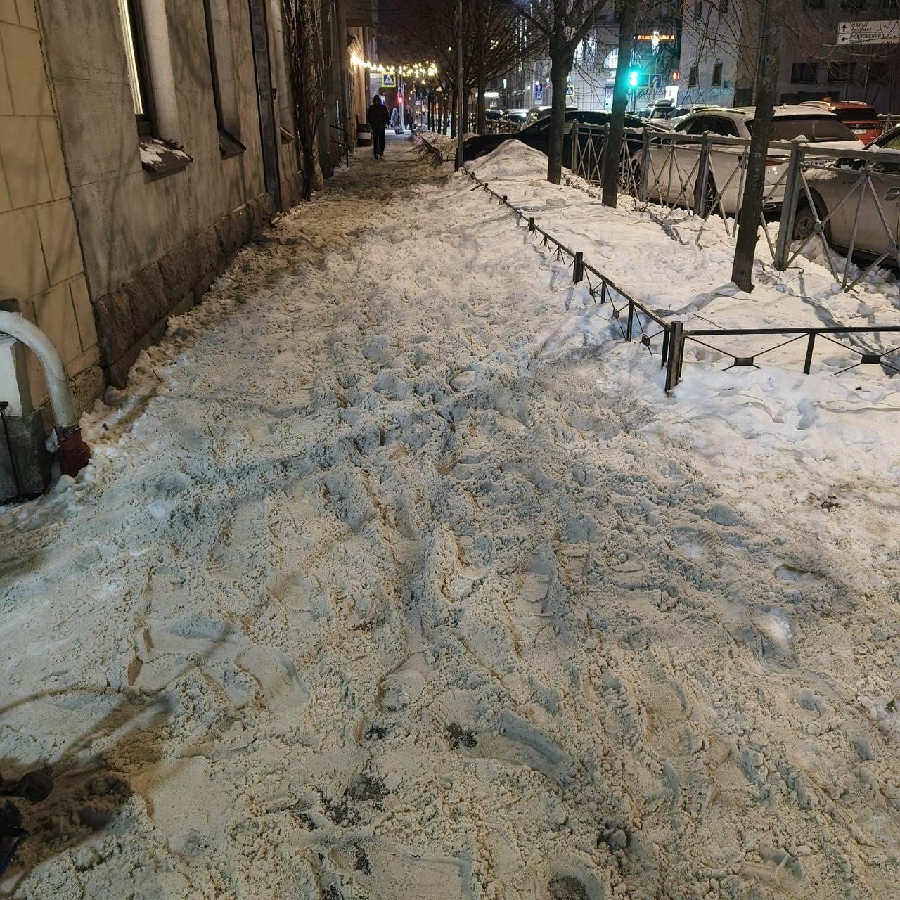 В день сноса мужчина зафиксировал на фото состояние тротуара у своего дома, полностью покрытого снежной жижей. На следующий день ситуация не изменилась. «Возмущает еще, что у нашего же дома пешеходная зона ни разу с Нового года не чистилась, несмотря на многочисленные обращения, а горку „опасную“ раскидали очень оперативно», — отметил Владимир.