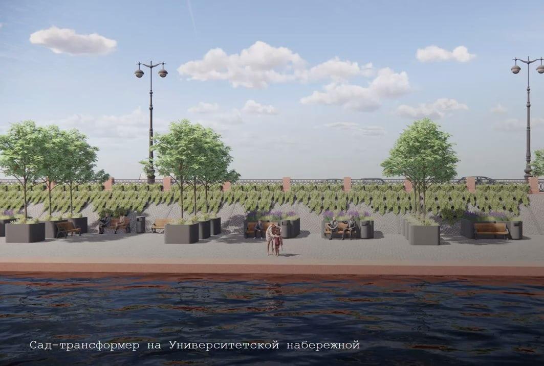Кроме того, в презентации была показана концепция сада-трансформера для Университетской набережной, где временное озеленение уже устанавливали в 2025 году.