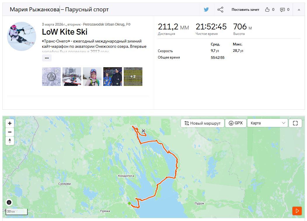 Организаторы отдельно отмечают достижение спортсменки Марии Рыжанковой. Её результат был зафиксирован в рамках международного зимнего кайт-марафона ТОКЕ (Trans-Onego Kite Enduro) на Онежском озере, где она преодолела 391 километр, что составляет более 200 миль. Этот результат считается громкой заявкой на победу.