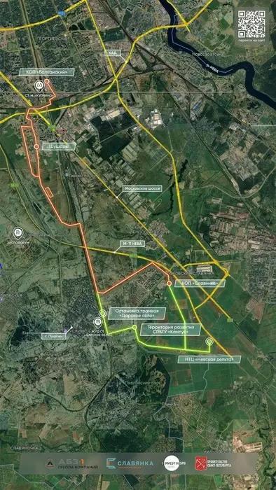 Маршрут вдоль строящейся Южной широтной магистрали (ЮШМ) станет связующим звеном. На востоке он соединится с линией на Колпино, а на западе – с трамвайной веткой до Южного. ЮШМ также пересечётся с существующей линией скоростного трамвая «Славянка».