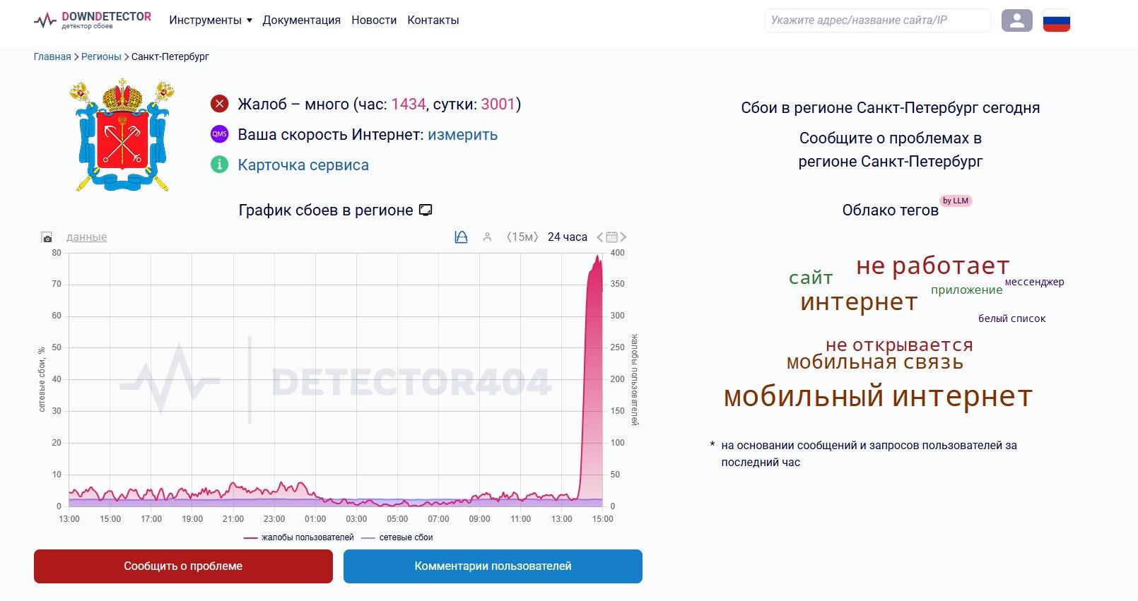 Параллельно с событиями в небе Санкт-Петербург столкнулся с масштабными сбоями мобильного интернета. Всплеск жалоб был зафиксирован около 14:00. Согласно данным, 49% пользователей полностью лишились доступа в сеть, а у 38% работали только сайты из так называемого «белого списка».