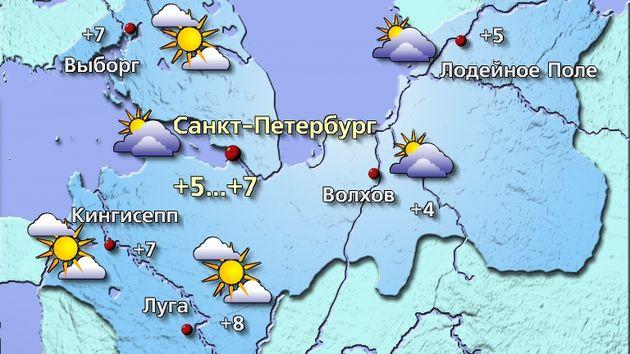В Петербурге ожидается облачная погода с прояснениями. На востоке Ленинградской области местами пройдут кратковременные дожди, возможен мокрый снег, продолжится похолодание. Температура воздуха в городе составит +6…+8 градусов, в области — от +3 до +8. Ветер северный, со скоростью 5-10 метров в секунду. Атмосферное давление повышается и достигнет 754 миллиметров ртутного столба, что ниже климатической нормы.