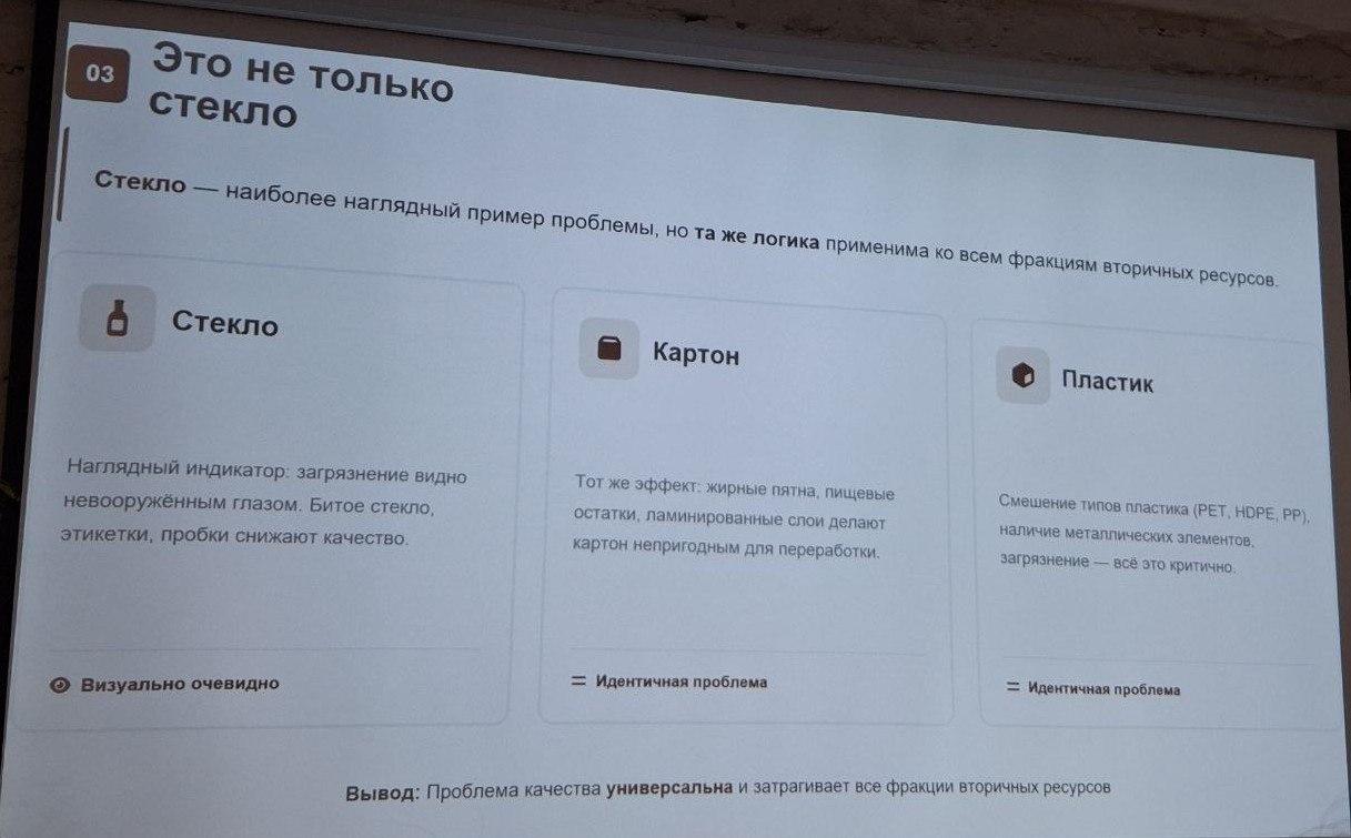 Гендиректор компании-переработчика стекла «Гласресайклинг Раша Центр» Юрий Десятников указал на снижение качества сырья из-за смешения отходов и прессования. Для сравнения, в Финляндии собирают 15 кг стекла на человека в год, а в Петербурге — только 2,7 кг.
