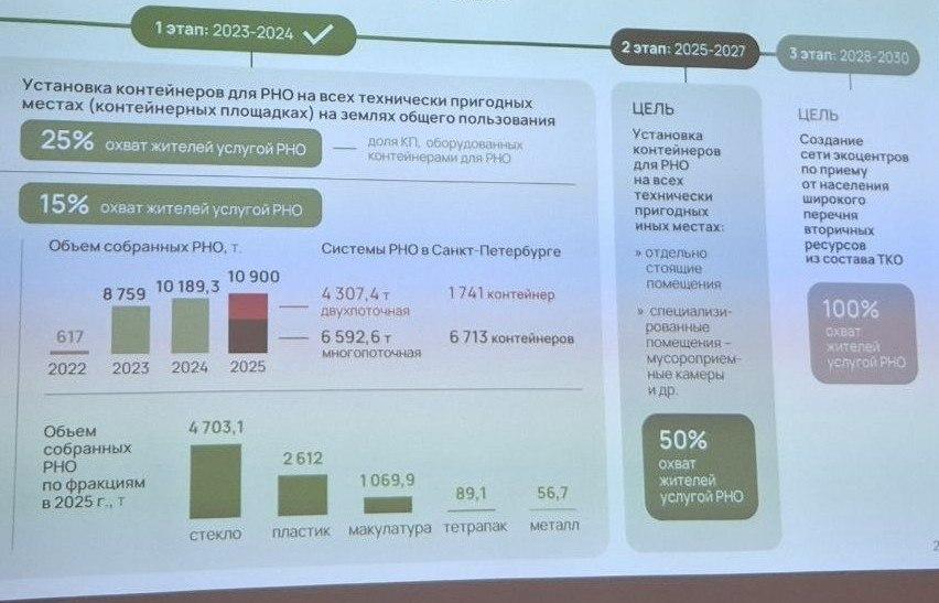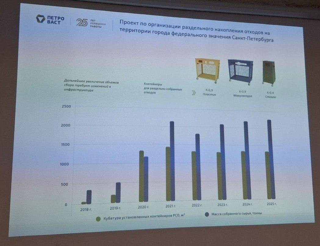 Текущая ситуация выглядит менее оптимистично. Частные пункты приёма закрываются, а некоторые виды материалов, например небутылочный пластик с маркировкой 1, стало сложно сдать. По информации комитета по природопользованию, на конец 2025 года в городе оборудовано около 4000 площадок с примерно 8400 контейнерами. Доступность инфраструктуры сильно разнится по районам: лучшие показатели у Петроградского, Пушкинского и Курортного районов, худшие — у Адмиралтейского, Красносельского и Колпинского.