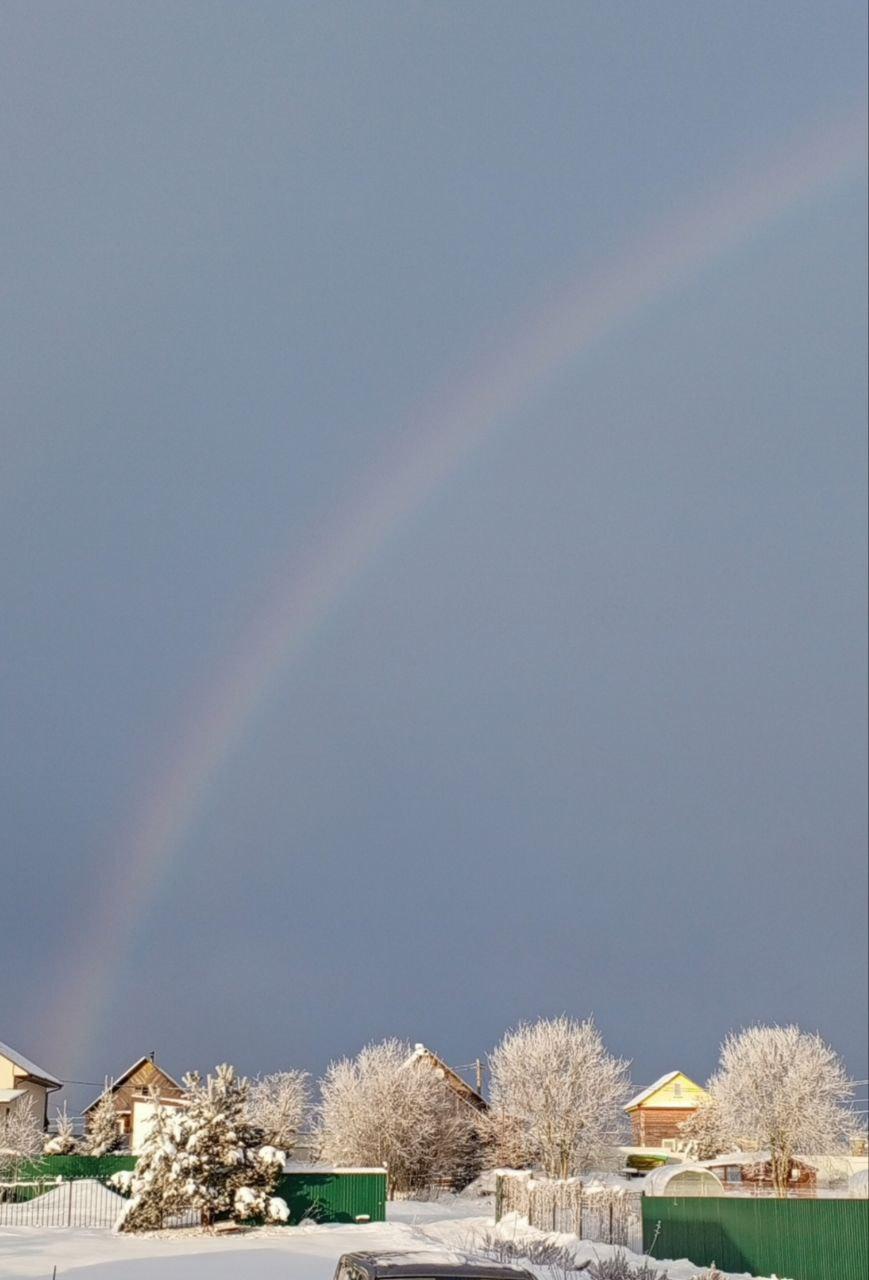 Зимой подобные цветные дуги иногда объясняются явлением гало. Оно возникает, когда солнечный свет преломляется в ледяных кристаллах перистых облаков, создавая белые или радужные кольца вокруг светила.