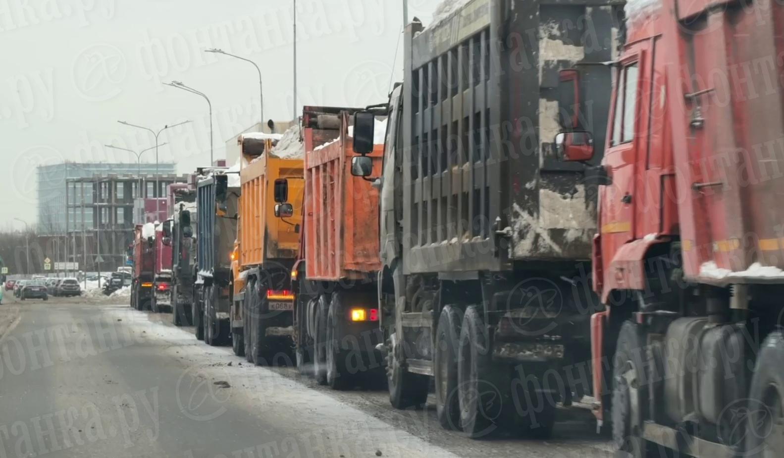 Из-за сильных снегопадов в Петербурге образовались длинные очереди грузовиков, везущих снег на утилизацию. На пункте на Мебельной улице скопилось более полутора десятков самосвалов.