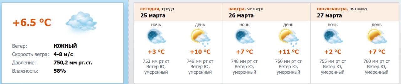 Прогноз на последующие дни: в ночь на 26 марта осадков не ожидается, температура составит +6…+8 градусов. Днём во вторник вероятен небольшой дождь, а максимум температуры достигнет +10…+12 градусов. В среду, 27 марта, существенных осадков не предвидится: ночью столбики термометров опустятся до +1…+3, днём поднимутся до +6…+8, а в отдельных районах — до +11 градусов.