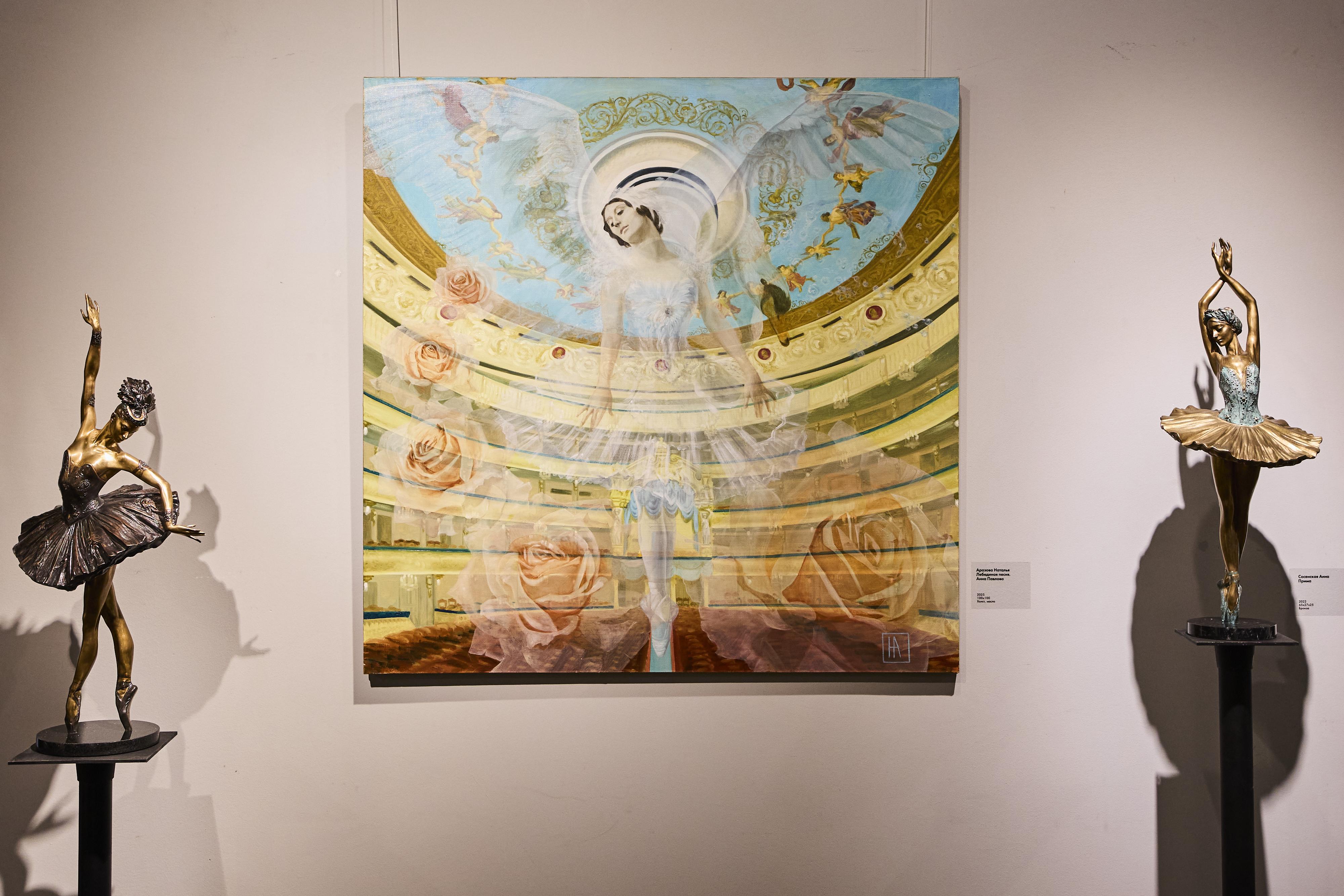 - В специальном зале с театральным занавесом разместился триптих, посвященный Майе Плисецкой, и композиция Коринны Моисеевой, где античные мойры изображены в виде уставших танцовщиц.