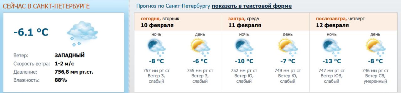 Согласно данным ФГБУ «Северо-Западное управление по гидрометеорологии и мониторингу окружающей среды», 10 февраля ожидается облачная погода с прояснениями и временами небольшой снег. Ветер будет слабым, западных направлений. Температура воздуха в 6 утра составила -6,1 градуса, днем прогнозируется от -5 до -7 градусов. На дорогах возможна гололедица, атмосферное давление будет постепенно понижаться.