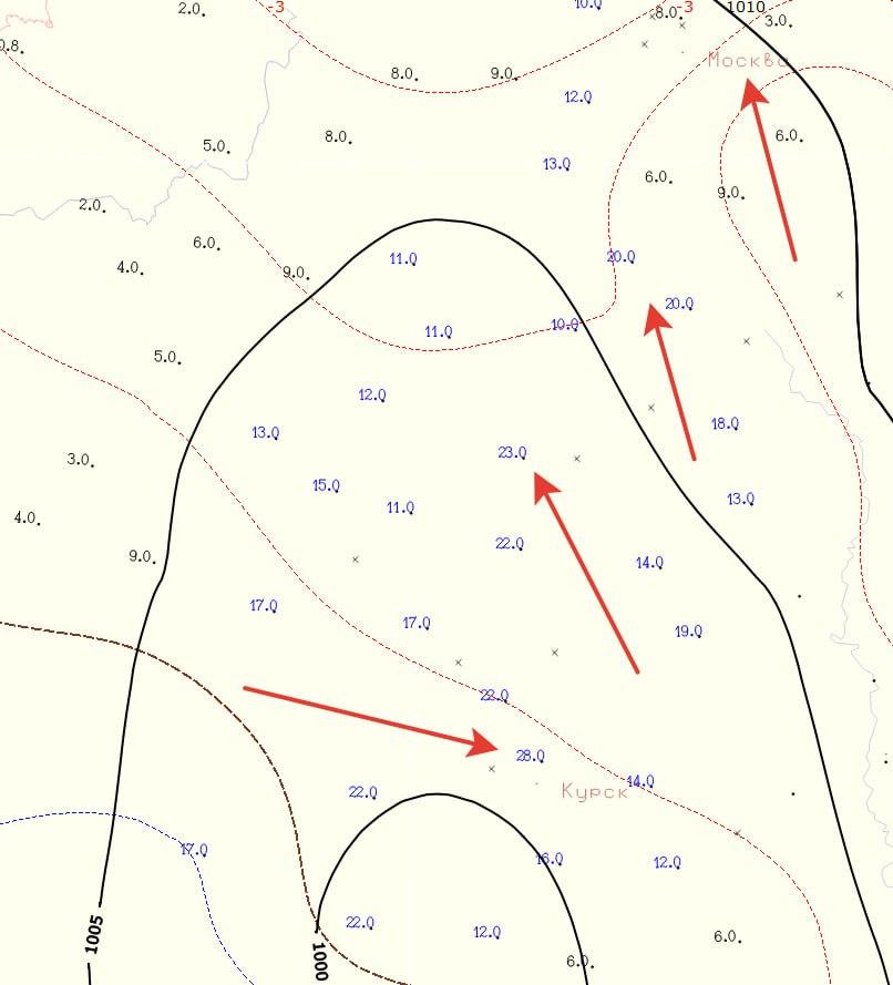 Центр вихря находится к северу от Харькова, но узкая полоса осадков вытянулась далеко на север. Наиболее интенсивные снегопады прошли в Курске и Орле, где выпало 20-28 мм снега.