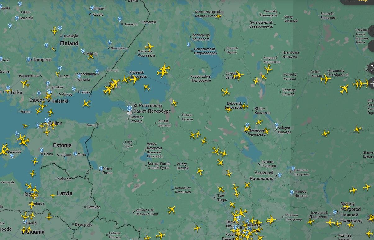 Согласно данным сервиса Flightradar24, воздушное пространство над Санкт-Петербургом и южной частью Ленинградской области в настоящее время свободно от воздушного движения.