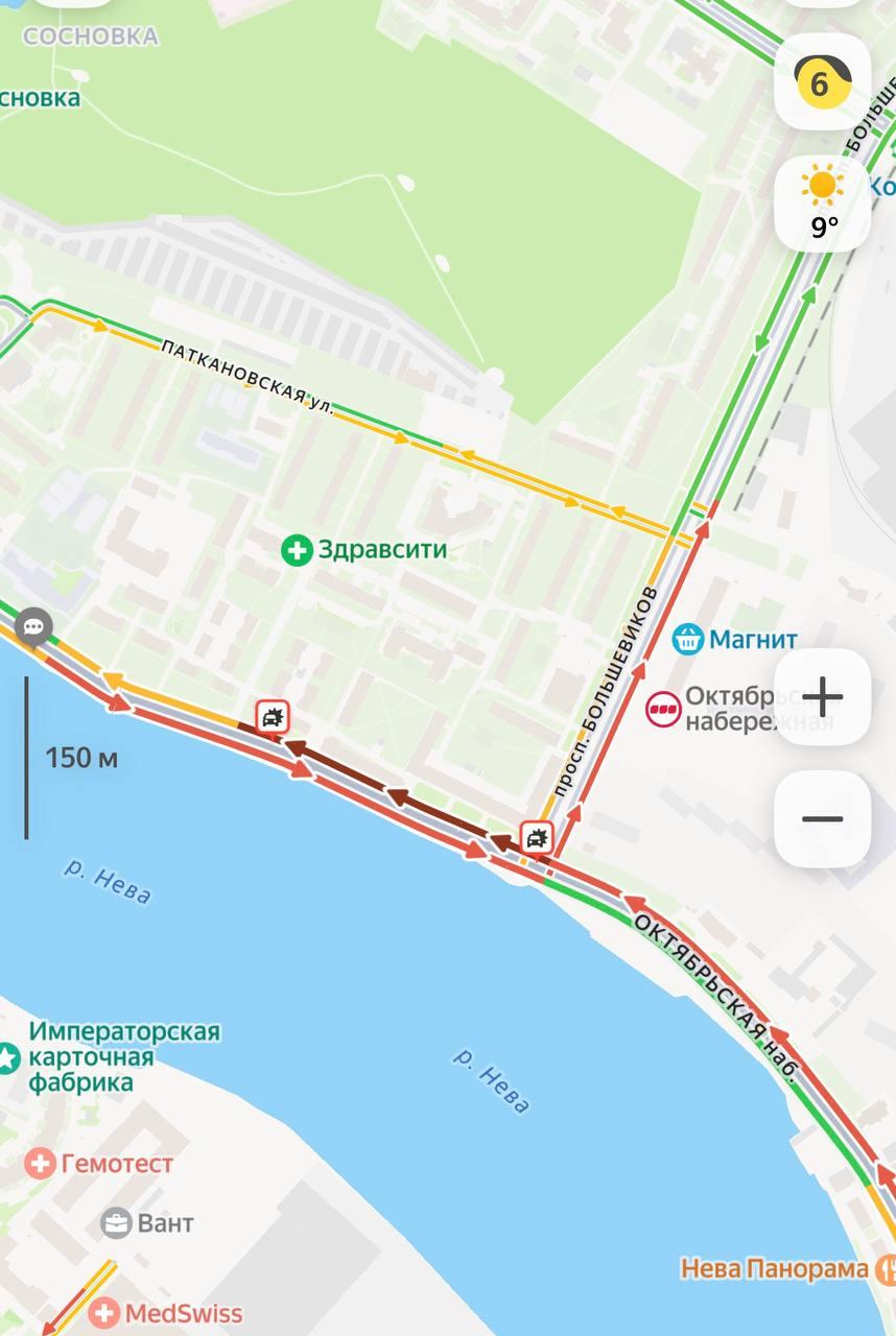 Вечером 10 апреля столкновение на перекрестке Октябрьской набережной и проспекта Большевиков привело к образованию затора протяженностью почти два километра.