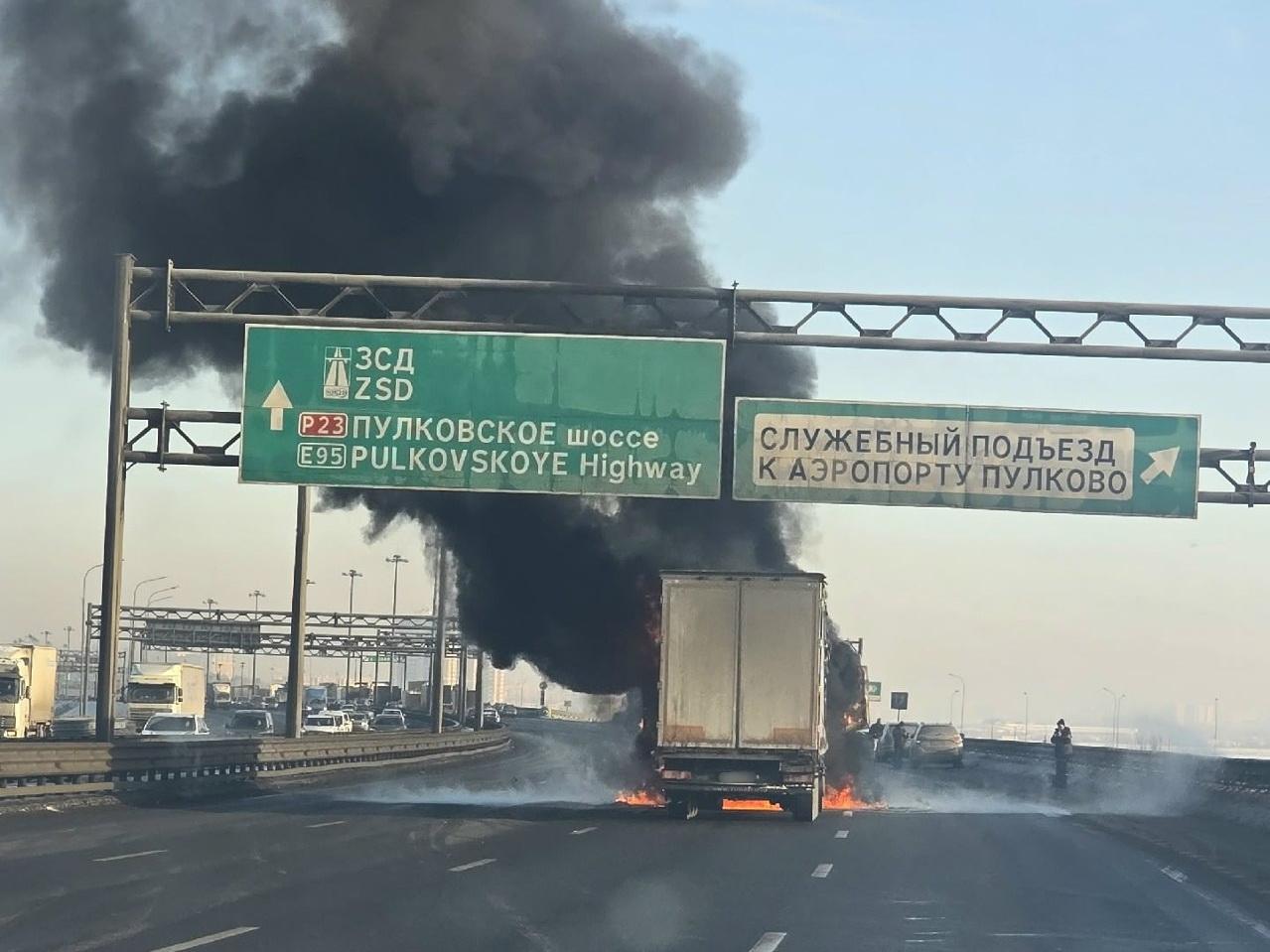 Горящий грузовик заблокировал КАД на юге Петербурга