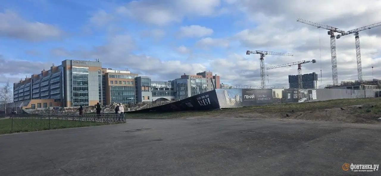 Утром 8 апреля возле здания Университета телекоммуникаций имени Бонч-Бруевича ветром вырвало строительное ограждение, которое рухнуло на газон.