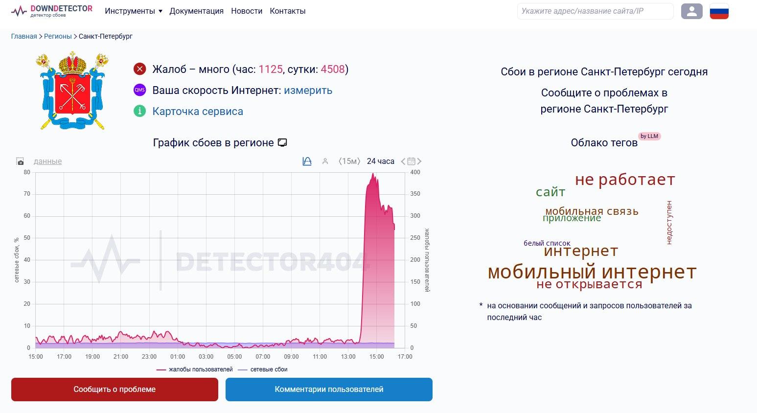Параллельно с этим, с примерно трех часов дня в Санкт-Петербурге и Ленинградской области фиксируются масштабные перебои в работе мобильного интернета. Жалобы от пользователей продолжают поступать.