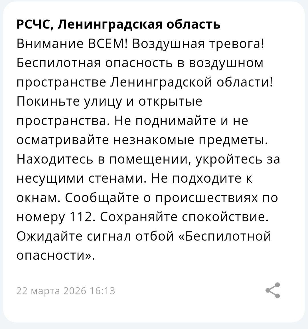 Александр Дрозденко заявил в 16:09 22 марта: «Внимание, объявлена опасность БПЛА в воздушном пространстве Ленинградской области. Возможно понижение скорости мобильного интернета».