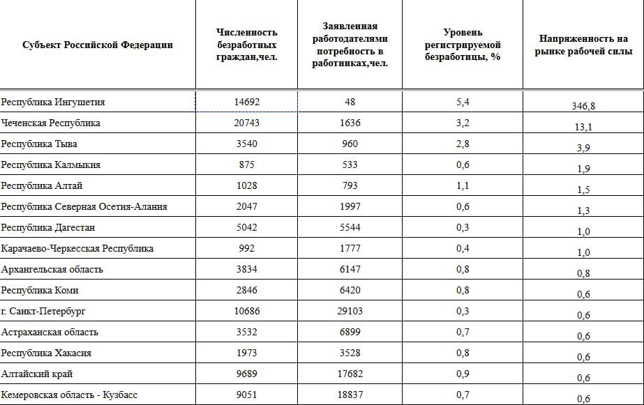Наиболее сложное положение с трудоустройством сложилось в регионах Северного Кавказа. В Ингушетии на 48 вакансий претендуют 14 692 человека, в Чечне — 1,6 тысячи предложений на 20,7 тысячи безработных, а в Тыве — 960 вакансий на 3,5 тысячи ищущих работу.