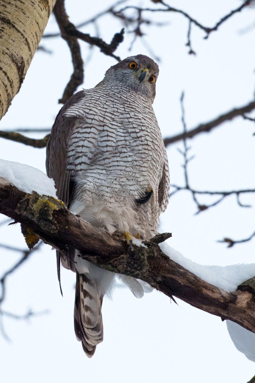 В конце января, когда в Санкт-Петербурге установились морозы, в Невском районе заметили ястреба-тетеревятника, пытавшегося согреть одну из лап. Хищник сначала сжал пальцы, а затем спрятал конечность в оперение и нахохлился.