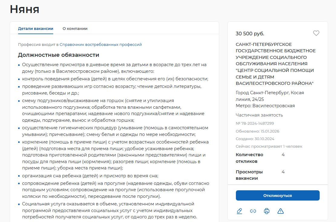 Няни трудоустроены в районных центрах социальной помощи семье и детям. Их зарплата зависит от условий трудового договора. Судя по архивным объявлениям, за полную ставку социальная няня могла получать 70–73 тысячи рублей. В настоящее время, например, в Центре социальной помощи семье и детям Василеостровского района ищут няню на неполный рабочий день с оплатой 30 тысяч рублей в месяц. Требования — отсутствие противопоказаний по здоровью и судимости. Обязанности включают игры, чтение, смену подгузников, приучение к горшку, умывание, кормление, присмотр во время сна и сопровождение на прогулке.