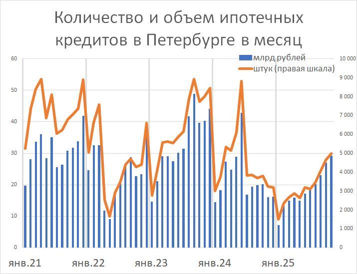 С середины 2024 года спрос на ипотеку действительно снижался, и к декабрю число выданных кредитов упало на 63,23%, достигнув минимума с 2022 года. Однако с января 2025 года показатель пошёл в рост. К ноябрю число предоставленных ипотечных кредитов выросло на 44,32% с начала года, а их объём — на 67,35%. Во втором полугодии 2025 года в Петербурге продали 2,7 млн кв. м жилья, что на 30% больше, чем в первом.