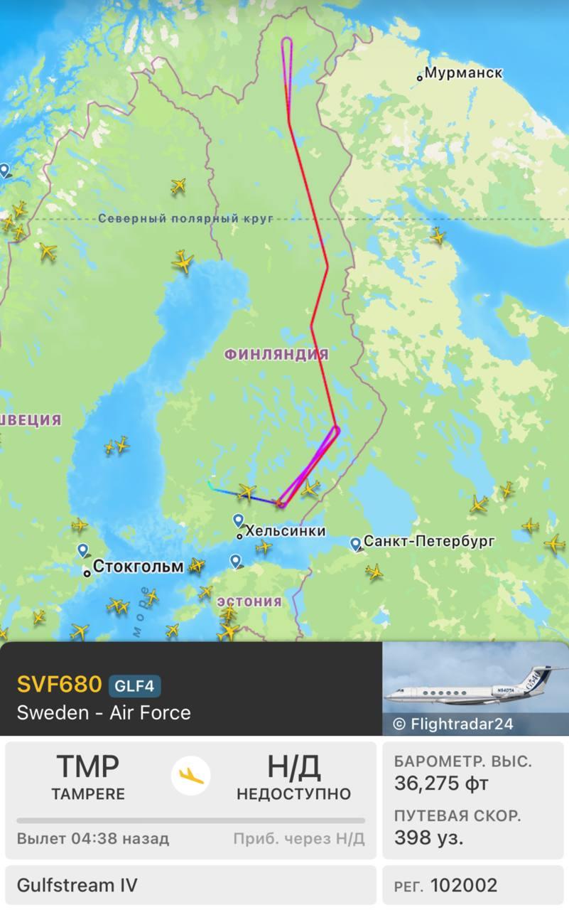 По информации Flightradar24, 31 марта в районе границы России и Финляндии был отслежен шведский военный самолет Gulfstream. Воздушное судно совершало петлеобразные маневры между городом Коувола и общиной Липери, а также один раз направилось в сторону Мурманска, достигнув крайней точки границы.