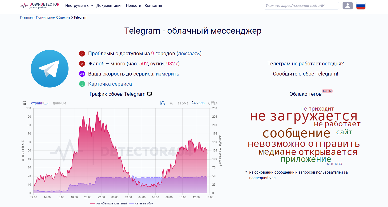 Согласно данным сервиса DownDetector за 15 марта, в России зафиксированы массовые жалобы на работу мессенджера Telegram. Только за последний час на сбои пожаловались более 500 пользователей. В общей сложности за 24 часа число сообщений о проблемах приблизилось к 10 тысячам.