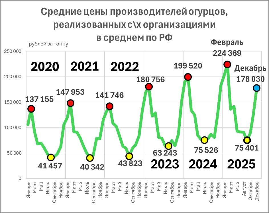 В Ленинградской области огурцы традиционно дороже, чем в среднем по стране. В январе 2025 года местная продукция стоила 325 рублей за килограмм против 201 рубля по России. В феврале разрыв увеличился: 379 рублей против 224. К марту цены снизились до 277 и 135 рублей соответственно. В сентябре огурцы из Ленобласти можно было купить за 155 рублей, тогда как средняя цена по РФ составляла 75 рублей, а в Краснодарском крае — всего 60. В октябре показатель в области снова вырос до 204 рублей, по России — до 88, в Краснодарском крае — до 87.