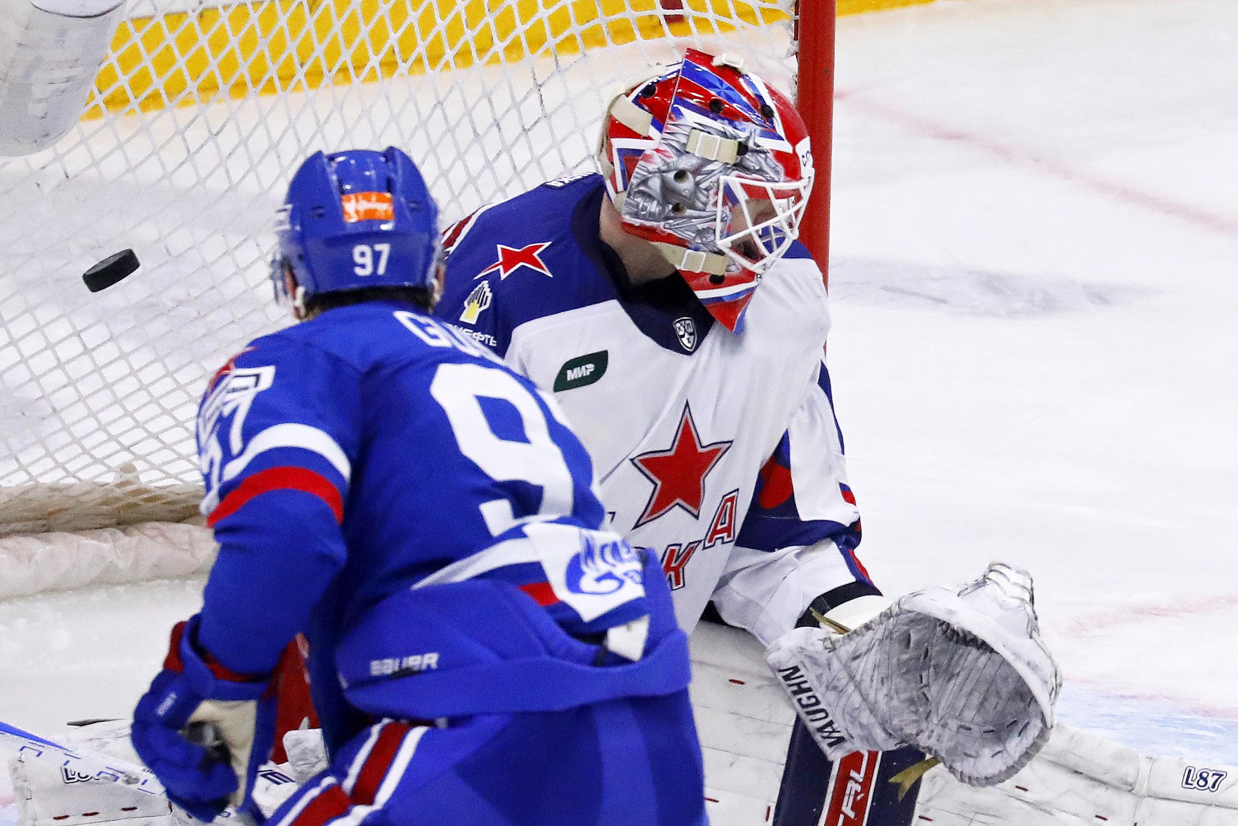 Эпизод матча КХЛ между СКА и ЦСКА. Никита Гусев атакует ворота, защищаемые Александром Шарыченковым.
