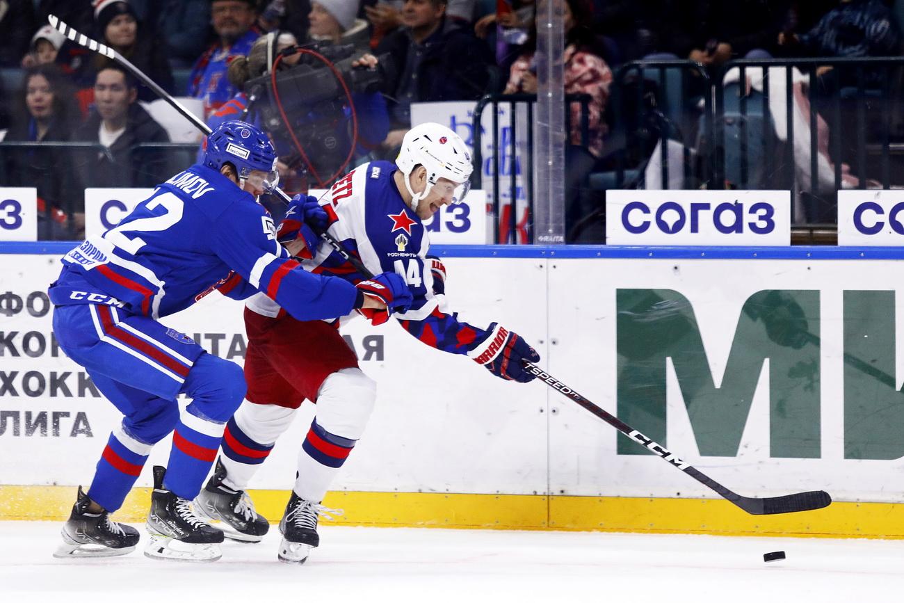 Эмиль Галимов (СКА) и Даррен Диц (ЦСКА) в игровом эпизоде матча КХЛ.