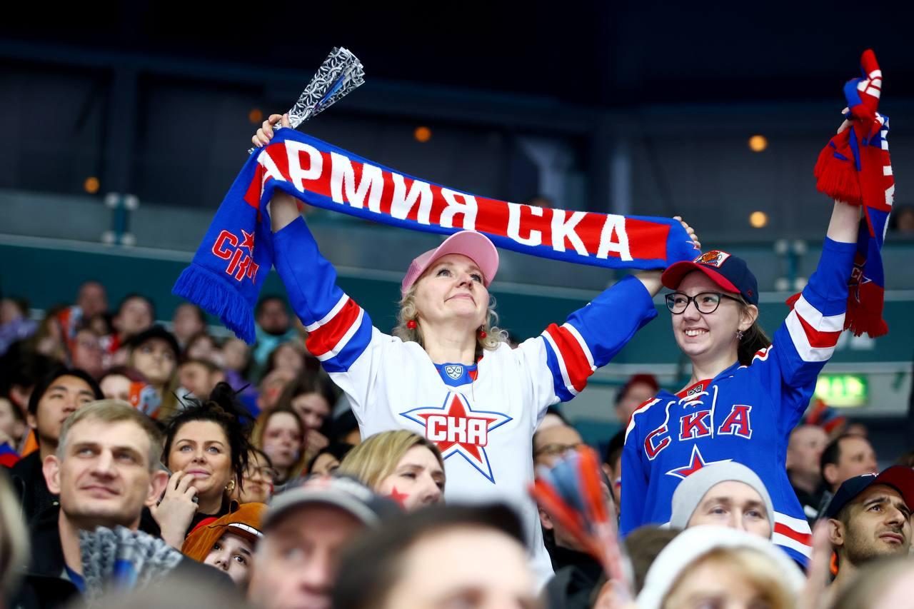Болельщики СКА активно поддерживают команду на трибунах во время матча.