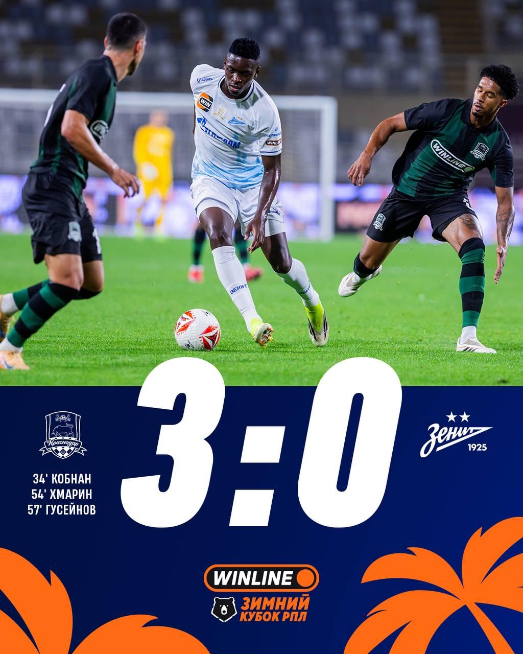 В матче Зимнего кубка РПЛ «Краснодар» одержал крупную победу над «Зенитом» со счетом 3:0. Встреча состоялась 6 февраля в Абу-Даби.