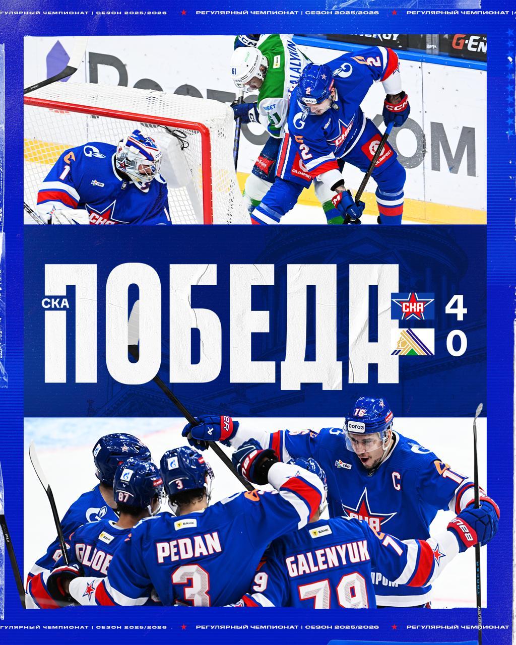 СКА из Санкт-Петербурга уверенно переиграл «Салават Юлаев» со счетом 4:0, продлив свою победную серию в КХЛ до пяти матчей. Вратарь Сергей Иванов оформил «сухарь», отбив все 35 бросков по своим воротам.